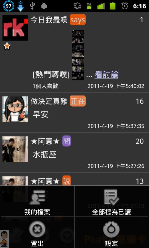 按下Menu鍵,可以看到我的檔案、全部標為已讀(在噗浪上俗稱放大絕)、登出、以及設定。