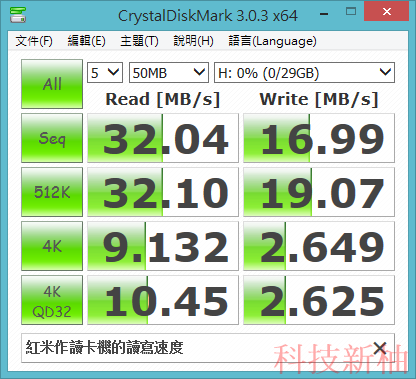 ▲ 這是將 ADATA 32G 插在紅米手機,把紅米手機當讀卡機測試出的讀寫速度,說真的出乎意料的快速。