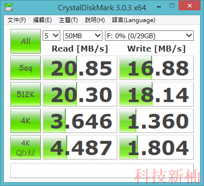 ▲ 上面都是在電腦上的測試,這張則是在紅米手機本身上的測試,App 辨識成內建記憶卡了,測試結果是讀取每秒 20 MB;寫入每秒 14 MB ,幾乎跟內建的速度相當。