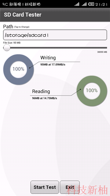 ▲ SD Tester 測試比較不方便,因為他必須用滑桿指定寫入檔案大小,不能用數字輸入方式指定,筆者測試的大小為 95 MB,測試結果讀取每秒 14 MB;寫入每秒 17 MB。