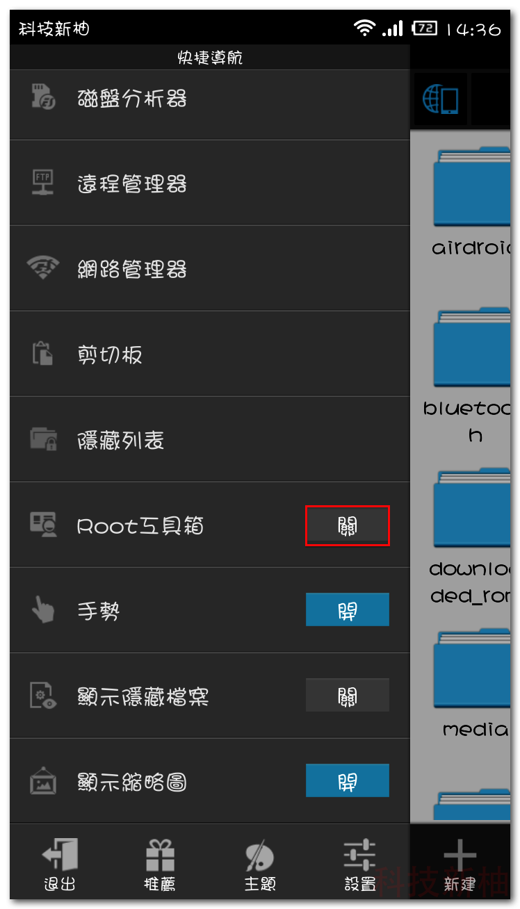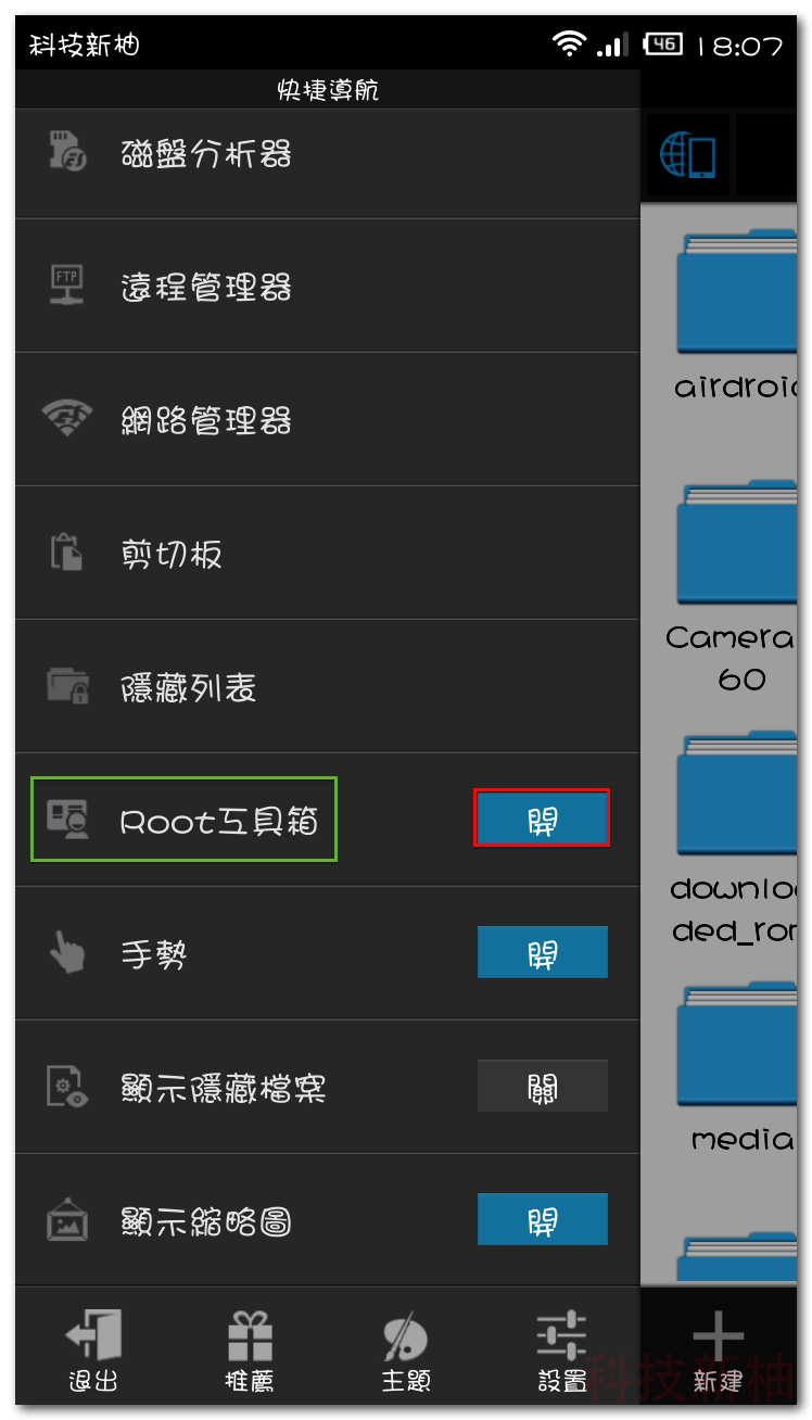 ▲ 下載免費的 ES 檔案瀏覽器,開啟之後,按下紅米手機三顆觸控按鈕中最左邊的選單鍵,開啟左側選單,先在「Root 工具箱」的開關位置(紅框處)按一次,使它變成「開」的狀態。