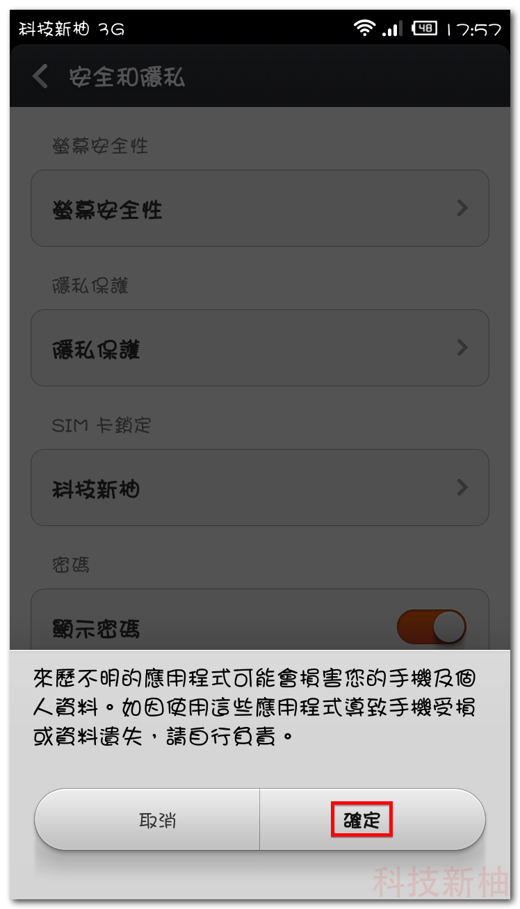 ▲ 系統會警告說安裝來歷不明的應用程式會損壞手機,必須自行負責,按下確定。