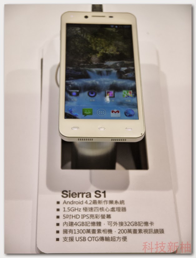 ▲ 首先看到的是 Sierra S1,這款手機採用 Android 4.2 系統、1.5GHz 四核心、5 吋 HD IPS 螢幕、內建 4GB,支援擴充 32 GB 記憶卡,為 GSmart 首款支援 OTG 功能的 Android 手機,可接滑鼠、隨身碟等設備。