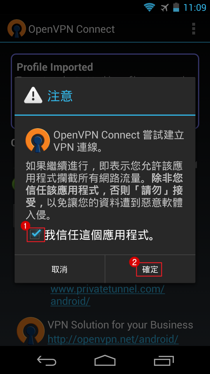 這時候系統會詢問將嘗試建立 VPN ,請先勾選「我信任這個應用程式」再按下「確定」。