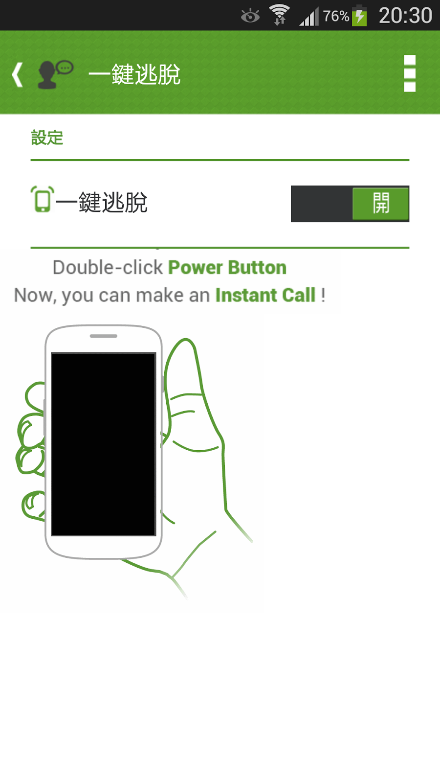 但我真正推薦的原因在於「一鍵脫逃」,使用方式就是按兩下電源鍵,立刻就會啟動虛擬來電,這才是最實用的功能。