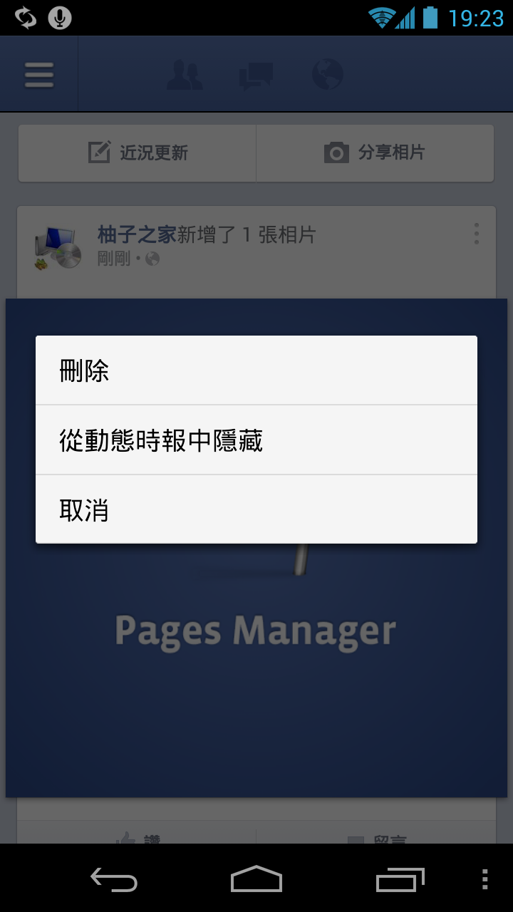 在動態的旁邊有三個直立的虛線,點擊之後就會跳出「刪除」、「從動態時報隱藏」以及「取消」的選項。