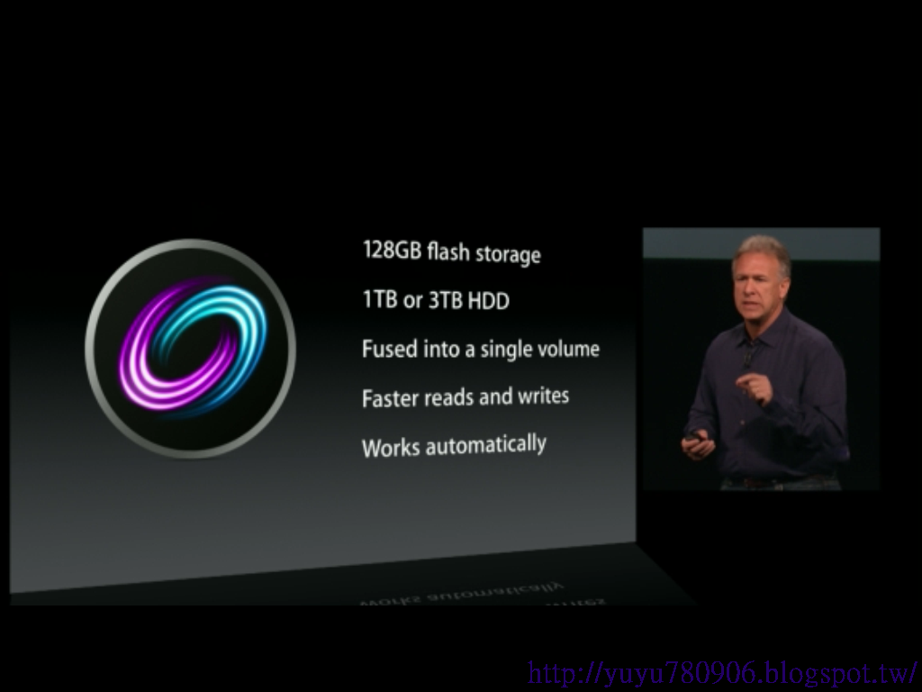 Fusion Drive 的搭配是 128GB Flash 配上 1TB 或是 3TB 的傳統硬碟、讀寫更加快速,而且會一拿到不需要任何設定就可以正常運作。