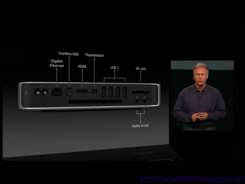 新一代 Mac Mini 配備有網路孔、FireWire 火線 800、HDMI、Thunderbolt 連接埠、四組USB 3.0、SD讀卡機以及音源輸出,這也是唯一新一代裝置中搭載所有資料傳輸介面的設備。