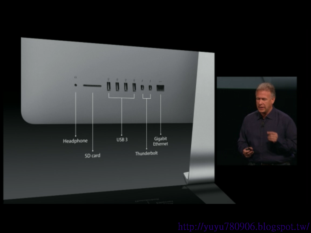 後方配置為耳機孔、SD 讀卡機、4組 USB 3.0、Tunderbolt 連接埠及網路孔。