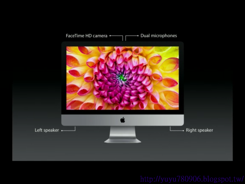 iMac 前方配置為 Facetime HD 視訊鏡頭、雙麥克風、左右喇叭。