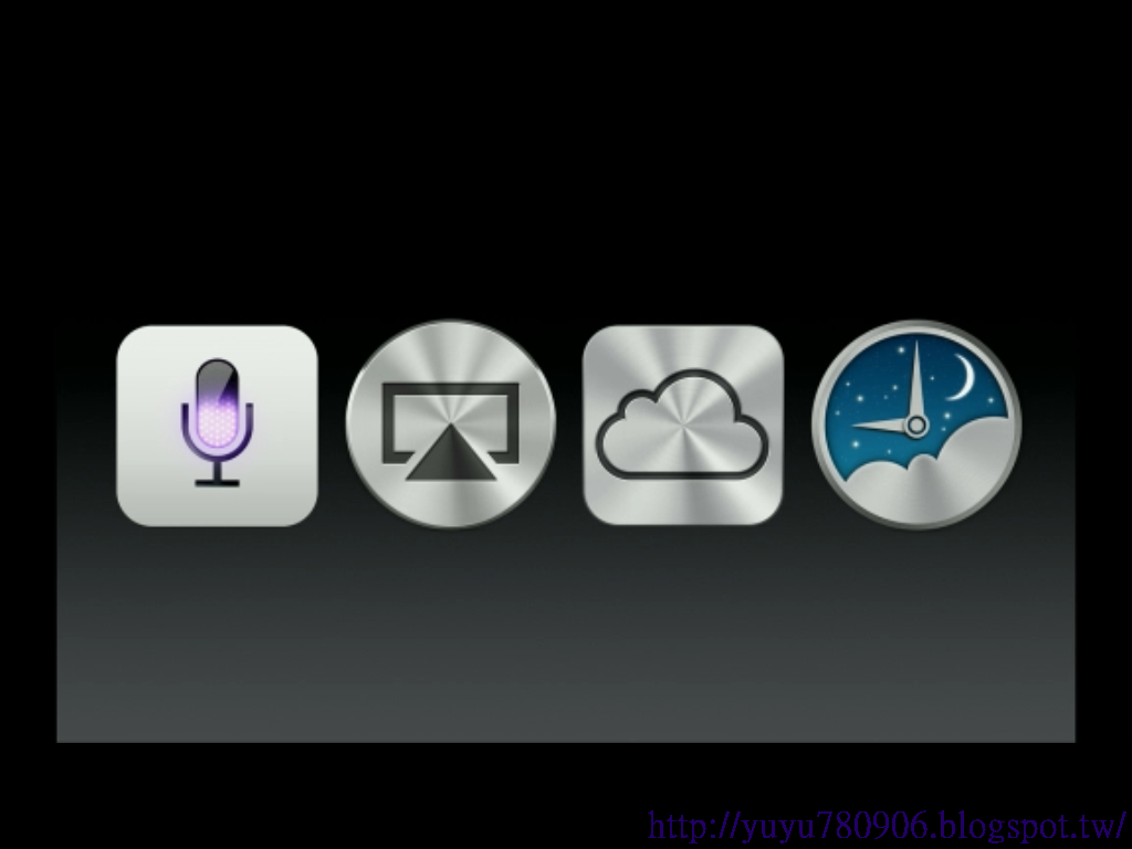 支援以上四個功能,從左邊開始代表語音輸入、Air Play 靜像輸出功能、iCloud 及待機更新的 Power Snap 。