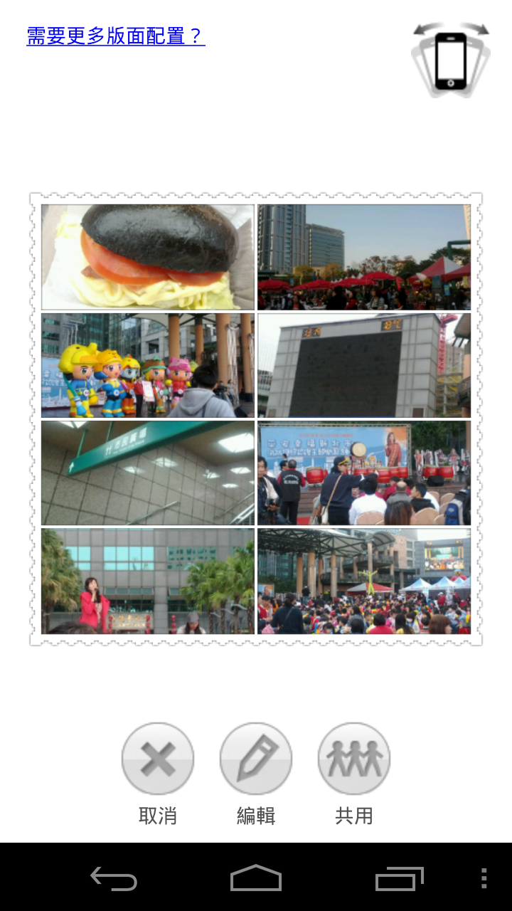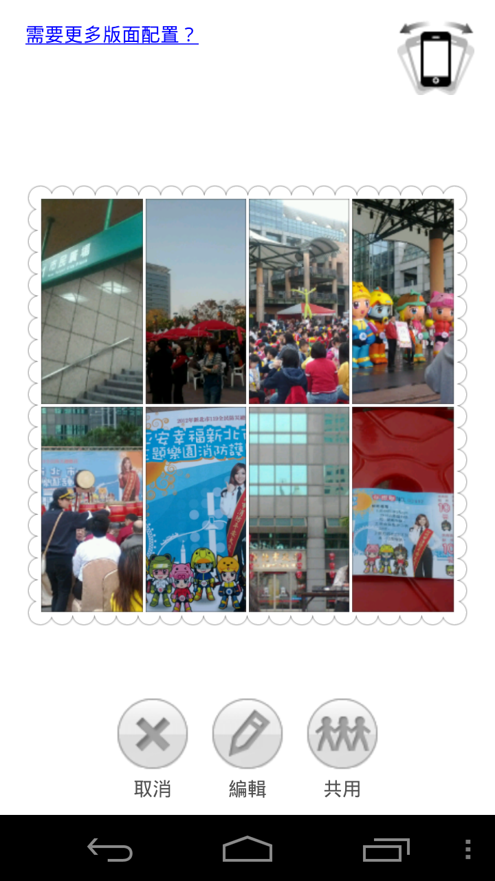 且因為微網誌通常有字數限制,如果沒有縮短網址的話,一次大概只能傳兩張照片,需要分成很多次上傳。PhotoShake!除了可以合併照片外,還有編輯照片與選擇排列及外框的功能,有些功能需要付費才能使用。