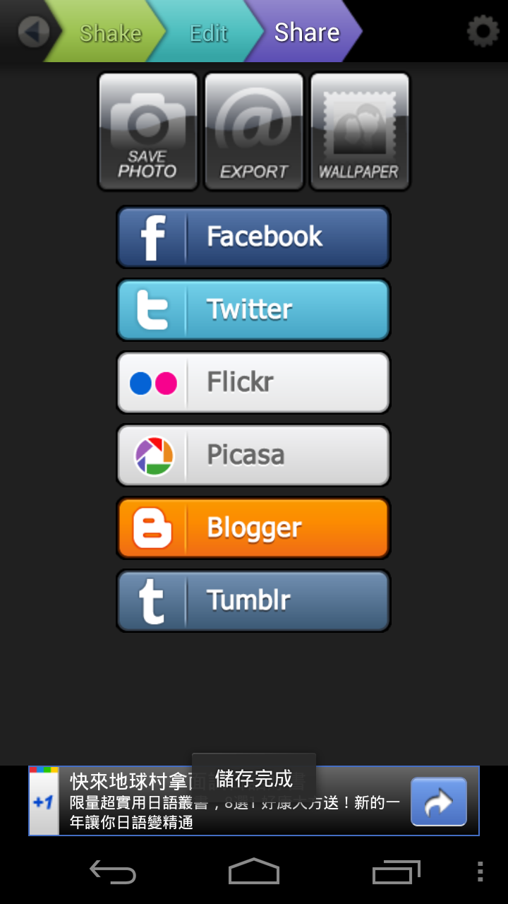 按下上方的Share可以分享到幾個城市內建的服務,或者上方有Save Photo(儲存相片)、Export(匯出)及Wallpaper(設為桌面背景)。