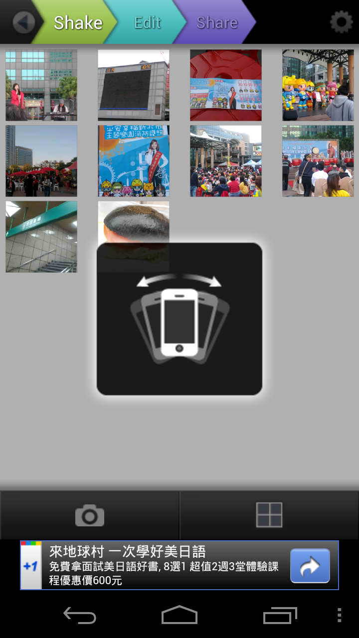 匯入完成後,就會看到搖晃手機的圖案,請搖晃手機,程式會自動將照片作隨機排列。