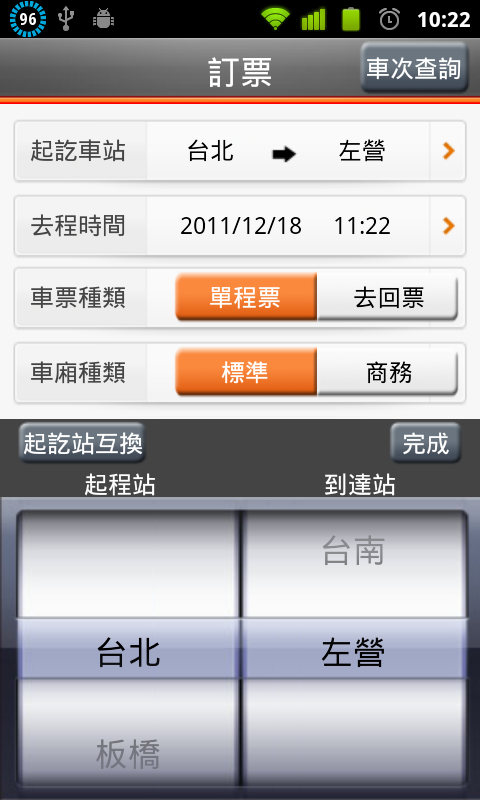 選擇車站的畫面,左邊是起程站,右邊是到達站,可以撥動選擇車站,也可以互換,選擇好之後請按下完成。