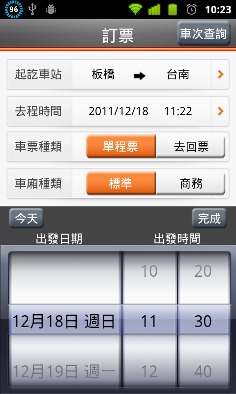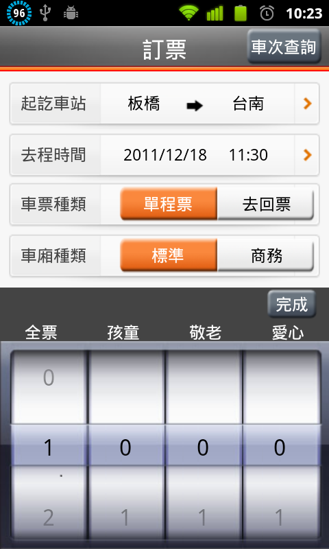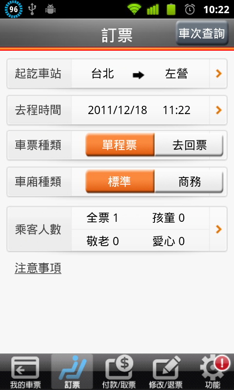 訂票,選擇車站、時間、票種、車種及人數。