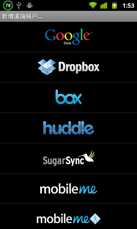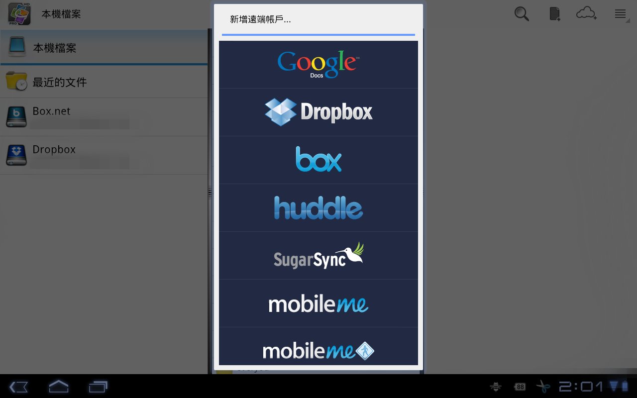 而主畫面的「帳戶」可以新增幾個知名的網路硬碟帳戶。