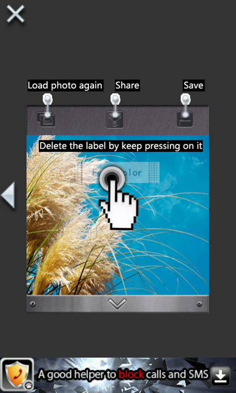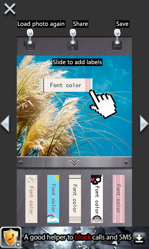 這是程式介面說明,上面由左而右為再次載入相片、分享、儲存;下面為選擇標籤。