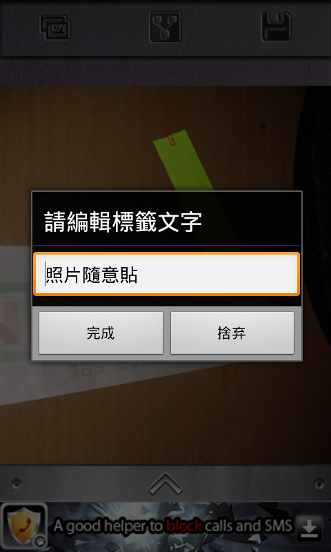 你只要在想要標籤的位置,使用手指頭一劃,就會彈出編輯標籤文字的對話,這是預設的文字,當然你可以任意修改成想要的文字,改完就按「完成」。(這也是直式操作)