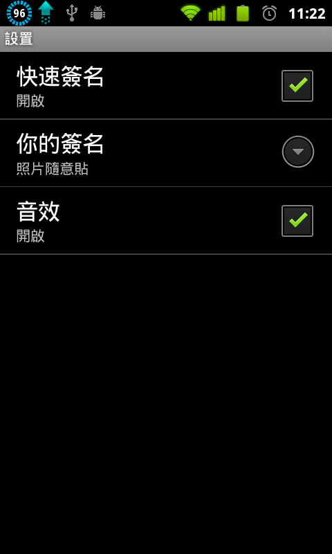 在程式操作畫面按下Menu選單鍵可以選擇設置進入設定畫面,你可以更改預設的簽名。